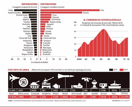 Logica dei blocchi. L’esame dei dati aggregati, con acquirenti e venditori assieme, dimostra che la vecchia logica dei blocchi ha lasciato tracce. Se Washington vende soprattutto ad Arabia, Emirati e Turchia, Mosca conta sugli acquisti di India, Vietnam e Cina. Pechino ha un mercato soprattutto asiatico, mentre per Parigi il denaro non ha odore: i primi tre clienti sono Egitto, Cina ed Emirati. Trasversale anche il mercato dell’Italia, che ha venduto soprattutto a Turchia, Algeria e Angola. Nel 2015 la spesa globale in armamenti ha raggiunto 1676 miliardi di dollari, con un lieve aumento rispetto all’anno precedente. La cifra equivale al 2,3 per cento del Prodotto interno lordo mondiale. Usa, Cina, Arabia Saudita, Russia e Gran Bretagna sono i Paesi che hanno investito di più. Gli Stati Uniti hanno ridotto leggermente la spesa, che resta però la più elevata del pianeta, pari a 596 miliardi di dollari. È il 36 per cento della spesa totale, e cioè è superiore secondo le stime del Sipri agli investimenti sommati dei dieci Paesi che seguono nella classifica. Fra le tendenze generali, la maggior spesa di Asia, Medio Oriente ed Europa dell’Est, e il calo degli investimenti nei Paesi con un’economia dipendente dal petrolio, legato al crollo dei prezzi del greggio.